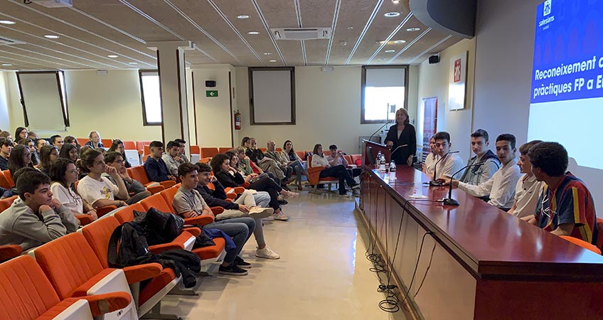 Alumnes de Formació Professional de Grau Mitjà van explicar la seva experiència de pràctiques a l’estranger. Els estudiants han remarcat la importància de participar en un programa de pràctiques Erasmus+, ja que els ha ajudat a millorar en el seu camp professional i a créixer com a persones. Per a concloure l’acte, els estudiants que han realitzat experiències internacionals han rebut un diploma per la seva participació en el programa Erasmus+.