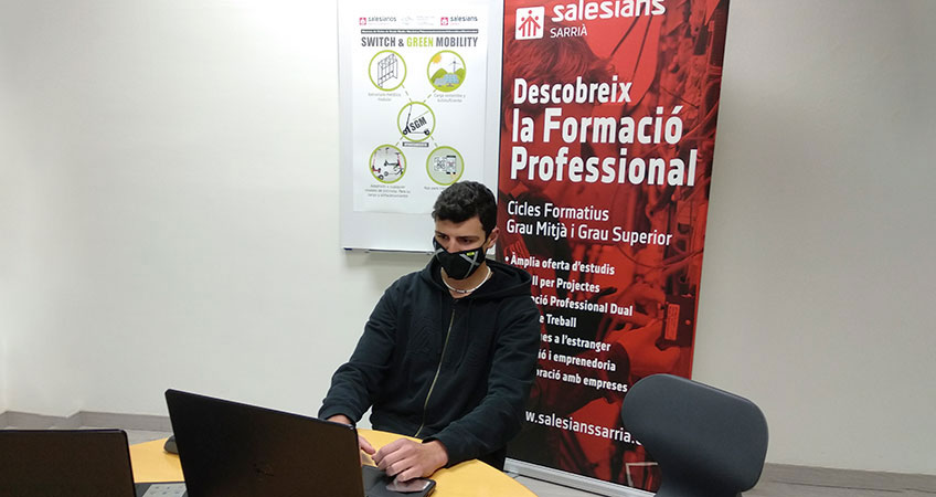 Cargar el patinete eléctrico de forma rápida y sencilla, sin cables y sin necesidad de recurrir a la electricidad convencional: esa es la innovadora propuesta del Switch & Green Mobility, el nuevo ‘parking inteligente’ de recarga limpia ideado por los estudiantes de Formación Profesional de Salesians Sarrià, Èric Santiago (Grado Medio de Mecanización) y Miguel Murillo (Grado Medio de Instalaciones de Telecomunicaciones).